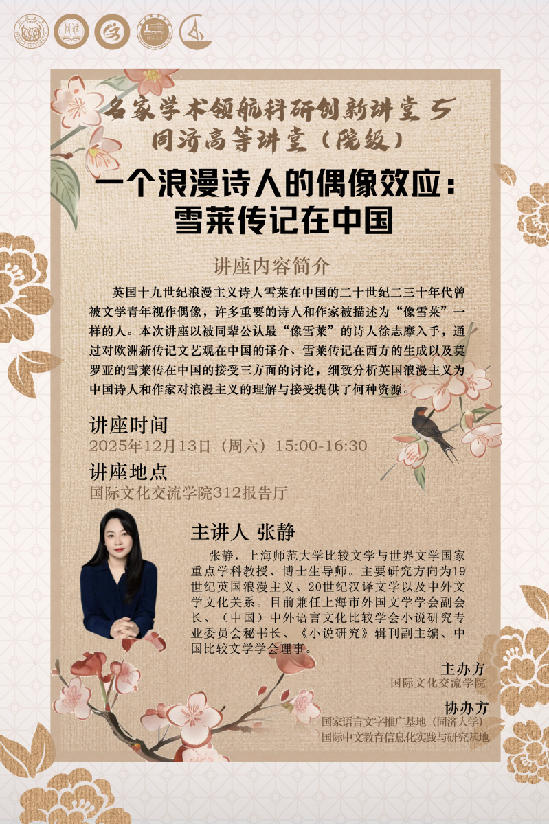 【讲座预告】名家学术领航科研创新讲堂5|张静:一个浪漫诗人的偶像效应:雪莱传记在中国
