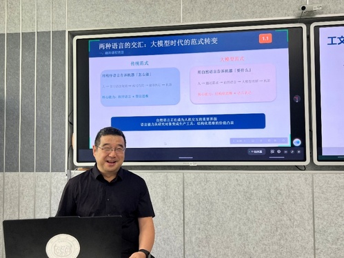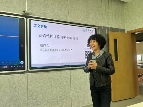 4月10日的讲座以《语言结构计算—学科融合课程》为题深入展开。荀恩东教授从索绪尔的结构主义语言学切入,引领听众探讨“两种语言(自然语言与程序语言),一种结构”的深刻内涵。他详细阐明了结构的三大基本要素——单元、关系与属性,并借助组合与聚合的双轴模型,生动揭示了从语言实例(语料库)到知识体系(知识库)的认知演进过程。在实践环节,荀教授现场演示了如何利用LangSC工具包通过低代码方式高效构建个人语料库,直观展现了计算技术如何深度赋能语言研究与教学实践。