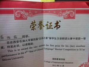 继10月24日我院2013届预科结业生帕克同学喜获江西省首届外国留学生汉语大赛一等奖后, 2013届预科结业生萨帕格同学又获得了西安石油大学第四届“汉语之星”留学生汉语朗读比赛一等奖。