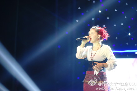 诚如大赛主持人对爱乐的描述所言,“爱乐,自由不羁的外表下掩藏着一颗深情的心,为周围的人送来一抹冰绿色的清新之景”。爱乐以她那让人们信赖的声音的力量,用一曲《The Voice》带领观众去找寻未来之光,挺进第二轮进入四强,随后又凭借一曲《让我一次爱个够》,以流利的汉语、深情的演绎,让观众们欢呼不断,掌声连连,最终收获了校园十大歌手的季军桂冠。