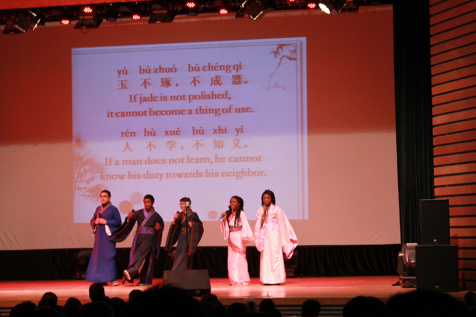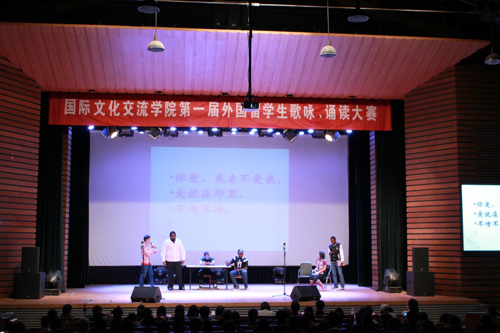 经过近两个月的精心筹备,12月11日下午,同济大学国际文化交流学院在学校一·二九礼堂成功举办了首届“脱口说汉语”外国留学生歌咏、诵读大赛。我院陈强院长、孙宜学副院长、韩国庆熙大学孔子学院中方院长赵卫东副教授、德国汉诺威孔子学院中方院长蔡琳博士、福建龙人古琴总经理谢建东先生一行,以及我校团委副书记杨旭涛老师一起欣赏了留学生们的精彩表演。