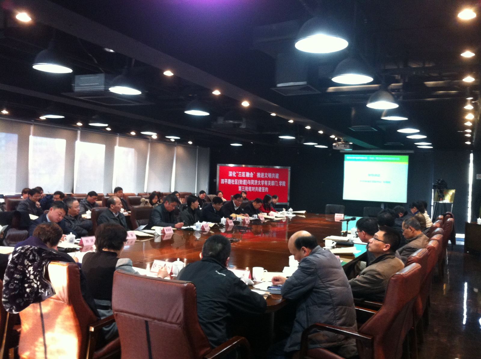 2013年12月24日下午,深化“三区融合”,推进文明共建,同济大学与四平路社区(街道)第三轮文明共建签约仪式在我校中法中心C401会议室举行。杨浦区区委副书记朱勤皓、四平路社区党工委书记程国光等领导,我校党委副书记马锦明,宣传部部长吴为民,以及同济大学共22个学院(部门)领导参加了签约仪式。我院陈强院长作为同济的三位签约代表之一与四平社区相关部门负责人签署了合作协议。