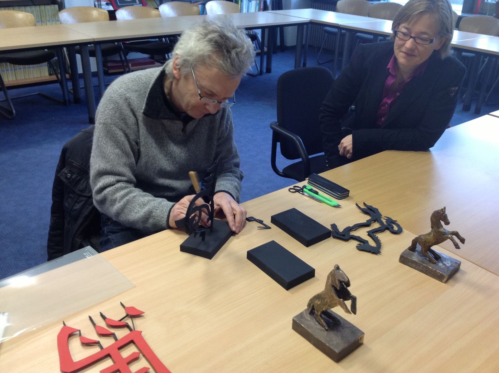 图片:雕塑家先生和孔院工作人员讨论马年雕塑方案