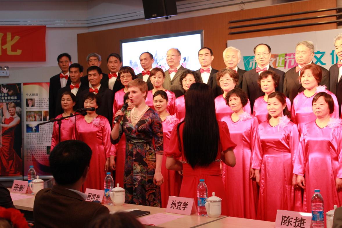 我院孔子学院奖学金生朱丽叶·皮特拉斯与社区合唱队共同演唱的开场音乐《我爱你,中国》,气势磅礴、震撼全场。朱丽叶是美国一位青年歌唱家,曾获得美声唱法基金会芝加哥布拉沃奖、艺术歌曲和歌剧美国奖,2011年成为“我唱北京”(I Sing Beijing)首届学员。2014年,朱丽叶获得国家汉办孔子学院奖学金,来到我院进行汉语学习。在老师和同学的帮助下,朱丽叶孜孜不倦地学习汉语,发音日趋纯正,演绎中文歌曲也越发游刃有余。她不仅为大家带来哈萨克民歌《玛依拉》,还与文化馆老师共同演绎美声二重唱《月亮代表我的心》。首首经典,博得满堂喝彩。