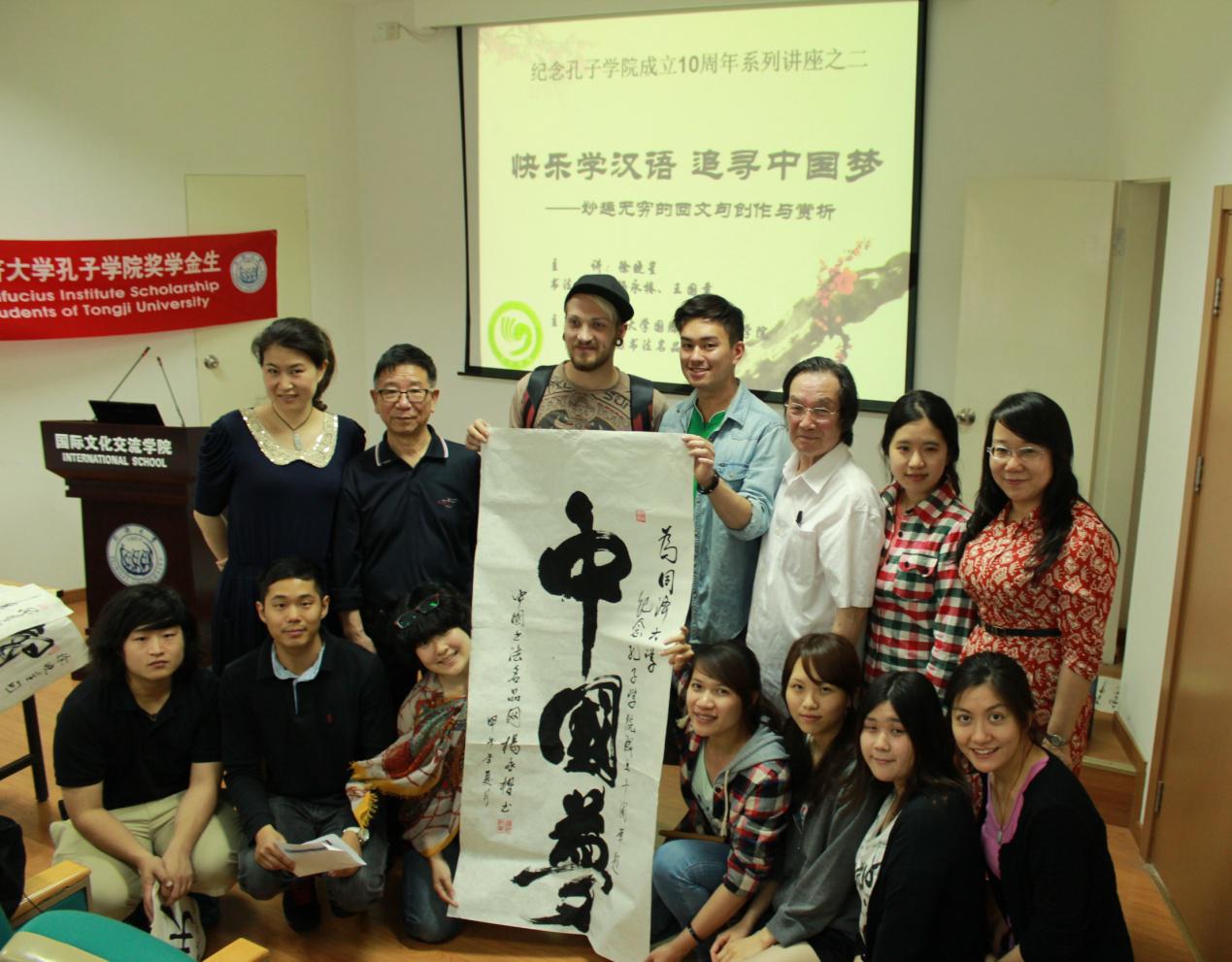 讲座结束后同学们纷纷与老师亲切交流,请书法家赠送墨宝,并合影留念。尽管来中国学习的目的不尽相同, 但“快乐学汉语、追寻中国梦”道出大家共同的心声。