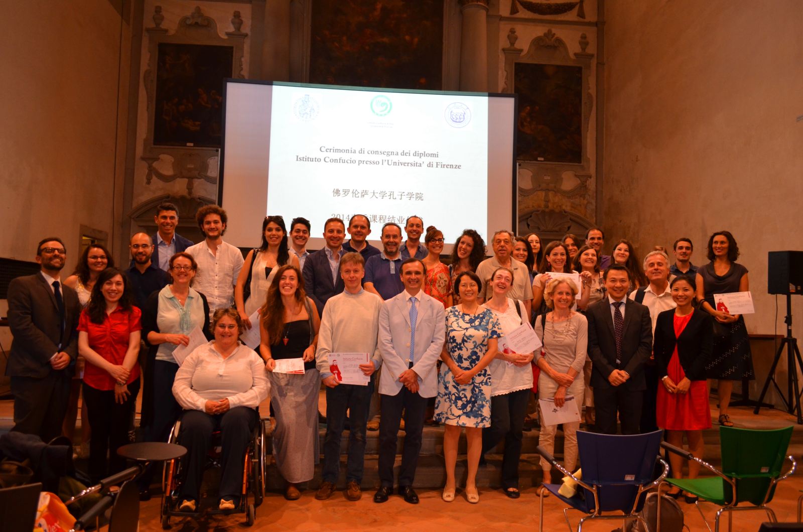 2014年7月11日,佛罗伦萨大学孔子学院在中心校区举办了第一期课程的结业仪式。中国驻佛罗伦萨总领事馆王新霞总领事、杨晗副领事受邀出席并致辞。王总领事祝贺课程圆满结业,并表示总领馆将继续对孔院给予关注与支持。佛罗伦萨大学副校长、孔子学院院长Marco Bellandi教授在仪式中祝贺学员们顺利完成课程,颁发了结业证书,并鼓励大家继续学习汉语和中国文化。