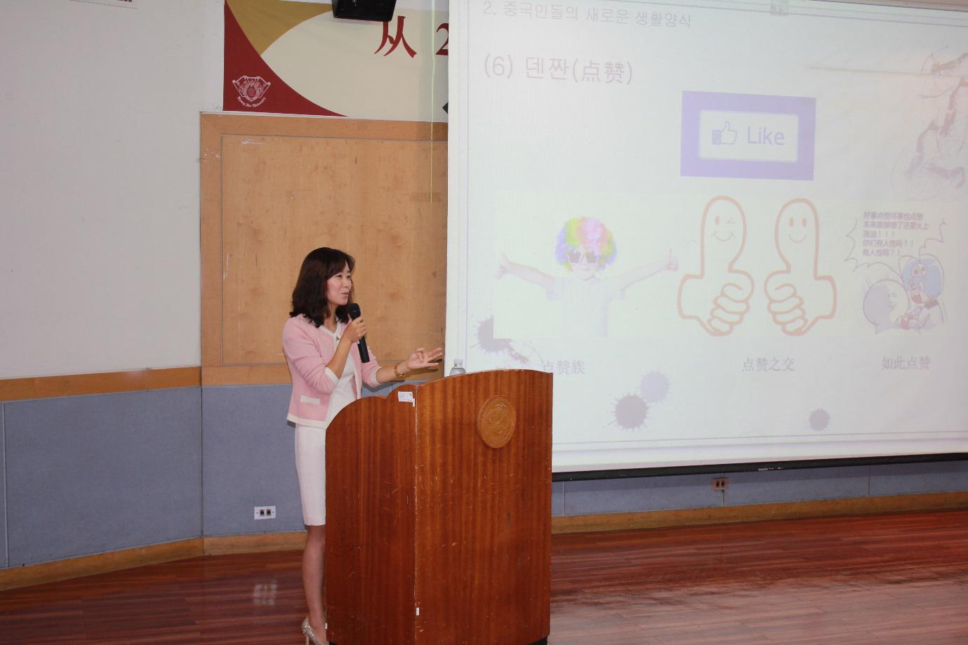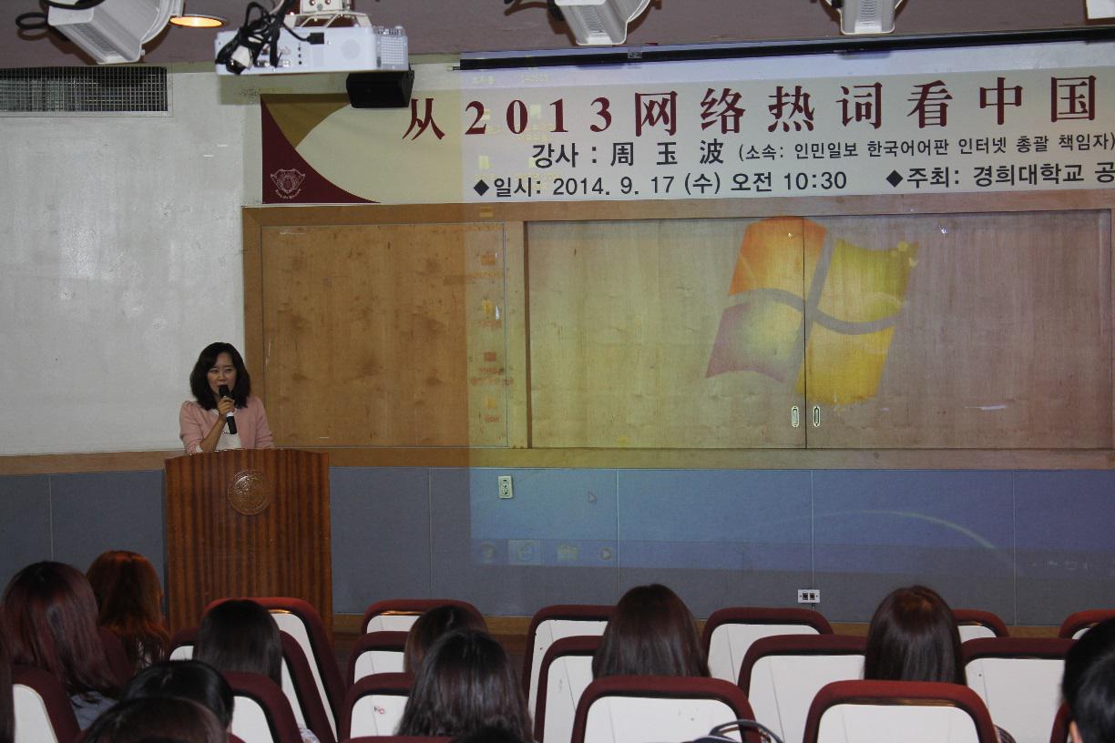 9月17日上午,应庆熙大学孔子学院的邀请,人民网韩国公司总经理、韩国中国商会副会长、韩国江原道名誉知事周玉波女士来到庆熙大学国际校区,为中文系师生做了一场题为“从2013年十大网络流行语看中国社会”的文化讲座。