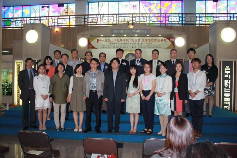 2014年9月26日上午,韩国庆熙大学孔子学院“孔院日”暨“孔院十周年”系列庆祝活动开幕式于庆熙大学国际校区中央图书馆大厅隆重举行。出席本次开幕式的有我校党委副书记徐建平教授、中国驻韩大使馆教育处参赞艾宏歌先生、韩国京畿道文化财团理事长洪基宪先生、韩国庆熙大学副校长李承翰先生等领导与嘉宾,以及韩国文化界、教育界各家媒体和庆熙大学广大师生。庆熙孔院中方院长赵卫东教授担纲活动司仪,李承翰副校长、艾宏歌参赞、徐建平副书记分别致开幕词,庆熙孔院韩方院长文炳淳对此次活动日程进行了简要介绍。众位领导和嘉宾与孔院全体教师合影留恋后,饶有兴致地参观了“韩国庆熙大学孔子学院成就展”、米金玉书画作品展、“我照相机里的中国”摄影大赛获奖作品展和UNESCO中国世界文化遗产图片展,还欣赏了中国茶道表演和中国传统乐器演奏。