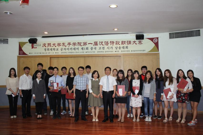 本次庆祝活动将持续两月,内容丰富,形式多样,精彩纷呈。主要包括京畿道地区小学生书法比赛、大学生汉语歌曲大赛、中国文化沙龙、中国美食节、大学生汉语辩论赛、“中韩书院研究”国际学术大会、中国现代文学作品翻译学术大会、中国文化讲座、中国文化论坛、特邀讲演等。“汉语古典诗歌朗诵比赛”作为本次系列庆祝活动的首发,于下午2点在庆熙大学外国语学院小剧场成功举行。进入决赛的20名选手声情并茂进行了朗诵,庆熙大学中文系周翠兰、卢相均教授担任评委,评出金奖一名、银奖两名、铜奖三名及优秀奖若干。此次比赛不仅弘扬了中国文学及文化,调动了外国学生学习汉语及中国文学的积极性,还预示了本次“孔院日”暨“孔院十周年”系列庆祝活动的成功。