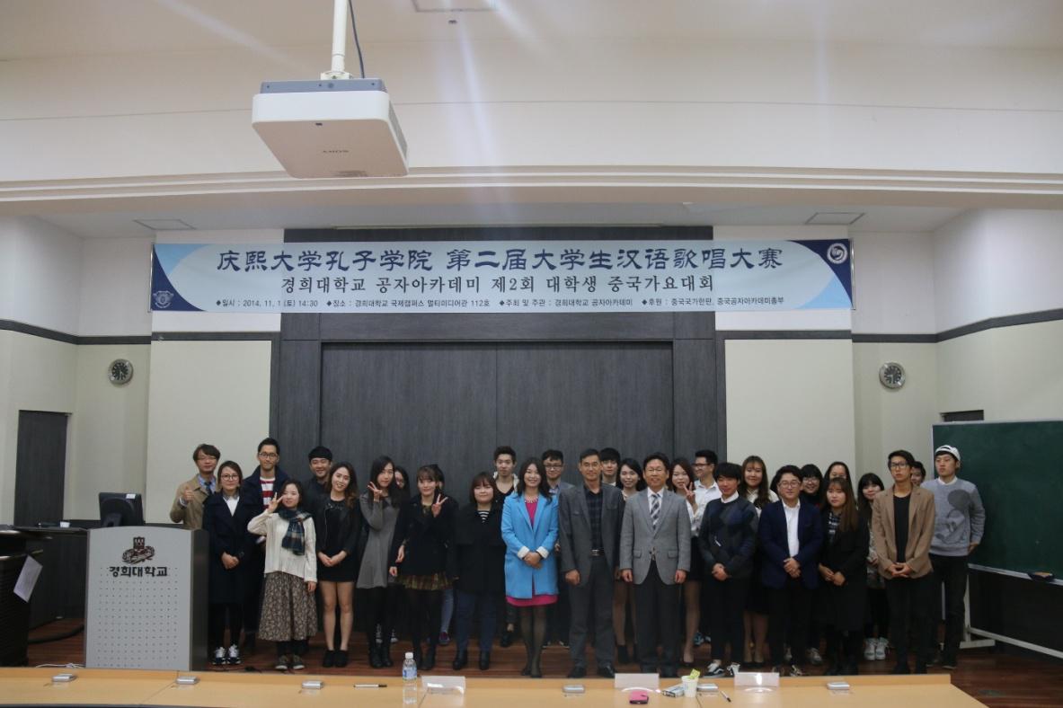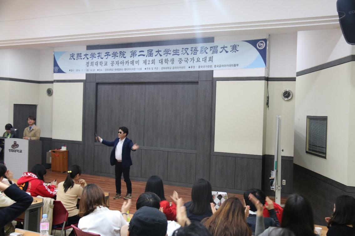 2014年11月1日下午,由庆熙大学孔子学院举办的“第二届大学生汉语歌唱大赛”决赛在庆熙大学多媒体馆举行。本次活动是“孔院日暨孔院十周年系列活动”之一。韩中艺术协会理事长彭丽颖女士等出席并担任专家评委。