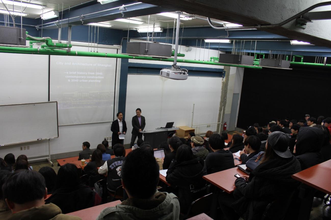王信博士全程用英语向听众们讲述了上海城市与建筑的过去,现在和未来。在讲座过程中,王教授清晰地梳理上海城市规划的历史和变迁,并对历史上具有代表性的建筑进行了重点介绍,同时也对上海将来的城市规划和变迁做出了合理的展望。这场讲座为韩国建筑学专业的学生们详细了解中国上海这座国际大都市的城市发展与变迁提供了非常宝贵的机会,大大加深了他们对中国城市发展的印象。讲座结束后学生们意犹未尽,踊跃提问,现场气氛热烈非凡。