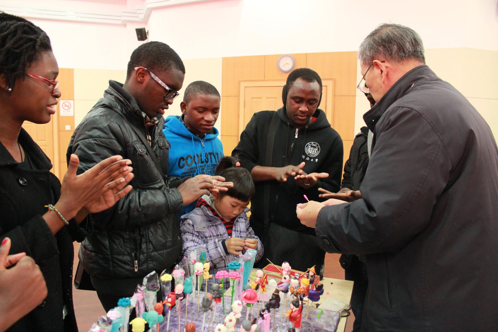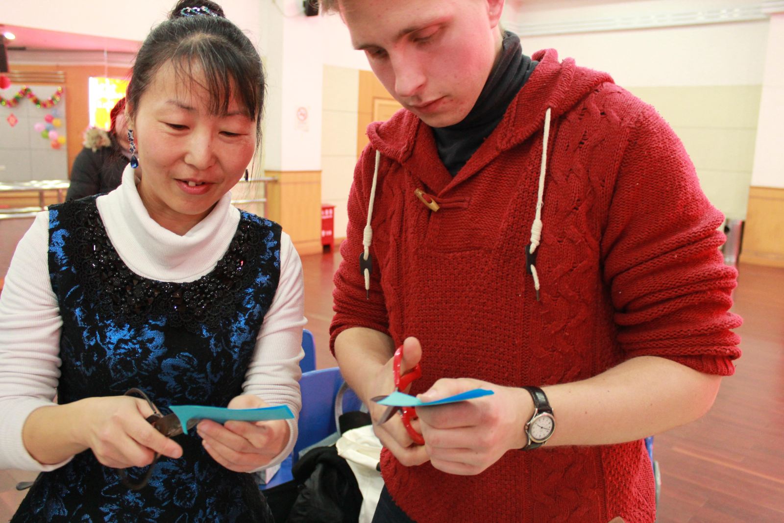 来自日本的横田诚治同学从小就对中国书法感兴趣,在老师的指导下自己动手写了一副春联。不少同学了解到中国过年家家户户贴春联、贴福字的传统,迫不及待地跟老师学写“福”字。来自波兰的孔子学院奖学金生严立行对剪纸特别感兴,跟着老师学起了基本技法。还有不少同学跟老师学习捏面人,捏出了一朵朵风格迥异的玫瑰花。
