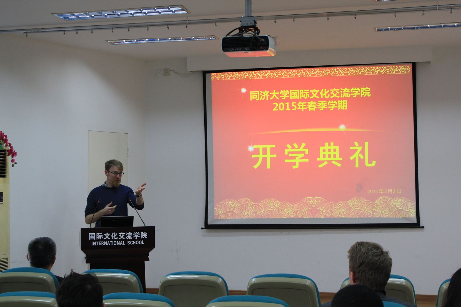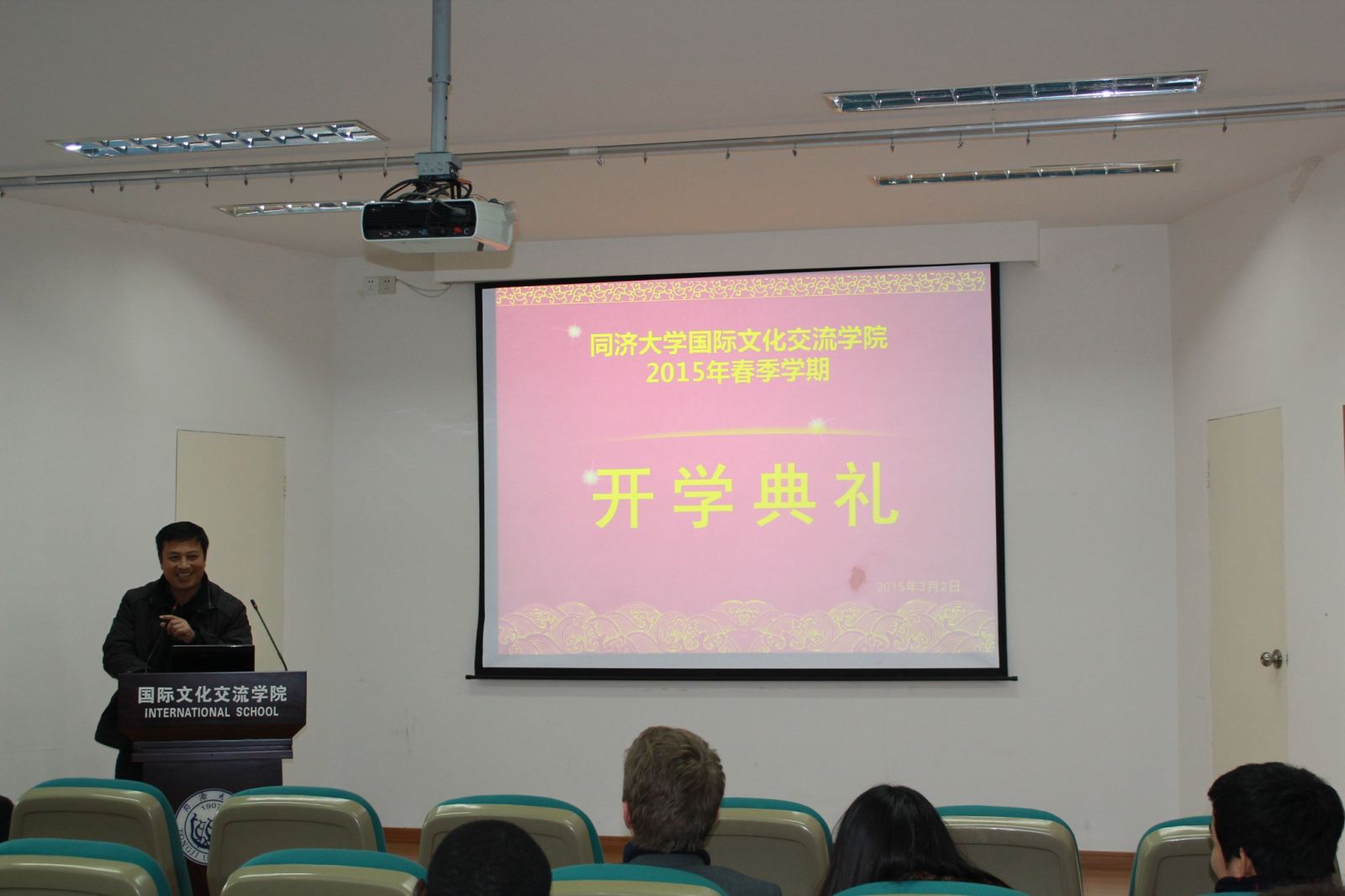 2015年3月2日,是我院春季学期开学的第一天。料峭的春寒掩抑不住师生们迎新的热情,为了迎接来自世界各国留学生的到来,学院在教学楼312报告厅举行了开学典礼,欢迎留学生新生们来到同济大学国际文化交流学院学习汉语。陈强院长、孙宜学副院长、留学生新生、新生班主任和部分任课教师出席了典礼。