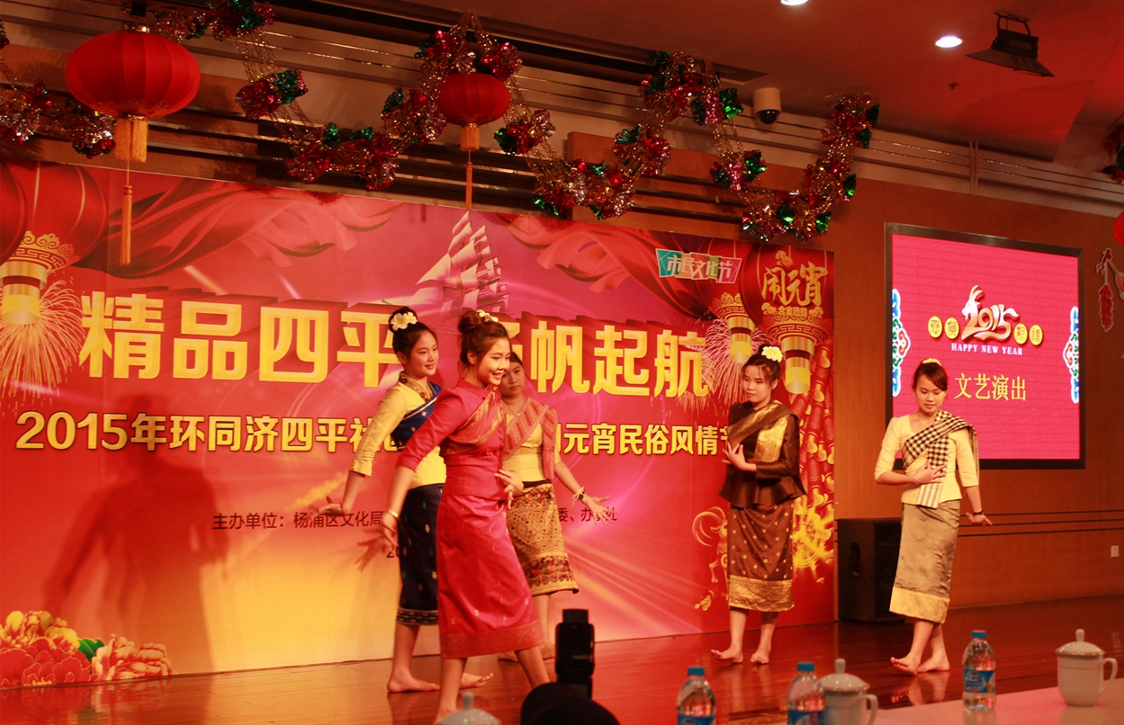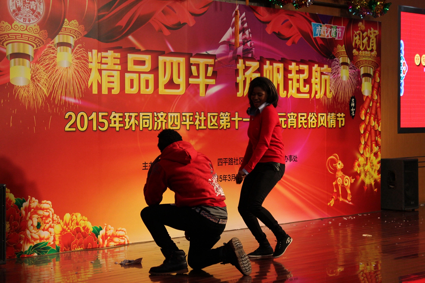 3月5日下午,2015年四平社区第十一届元宵民俗风情节活动在社区文化活动中心拉开序幕。我院来自德国、俄罗斯、老挝、美国、日本、意大利等10多个国家近30名留学生来到四平社区,与居民们共同庆祝元元宵节中国。老挝奖学金留学生把家乡风俗带进社区,盛装为大家奉上传统舞蹈——《欢乐乡村》。罗岚和卡巴瑟利在一曲热情的非洲舞蹈《AZONTO》后,用中文为大家送上了真挚的节日祝福 “祝大家元宵节快乐!”