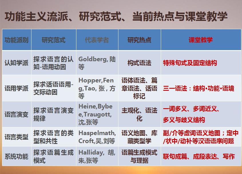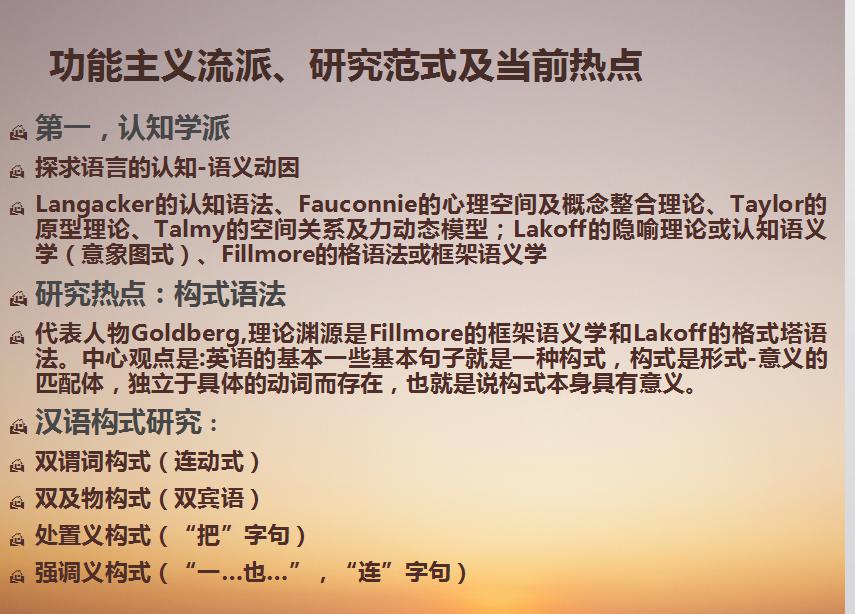 演讲从语言学界功能主义与形式主义两大阵营的由来谈起,具体介绍了二者在语言观、研究理念与研究方法的差异。进而详尽介绍了当前功能主义语言学的五大流派,具体包括五大流派的渊源、研究范式、代表学者及其突出成果、当前研究热点、汉语学界的最新进展及对第二语言课堂的启示。这些热点理论与方法对解决第二语言教学中的难点,比如汉语语序问题、汉语特殊句式、一词多义与多词近义现象都有帮助。