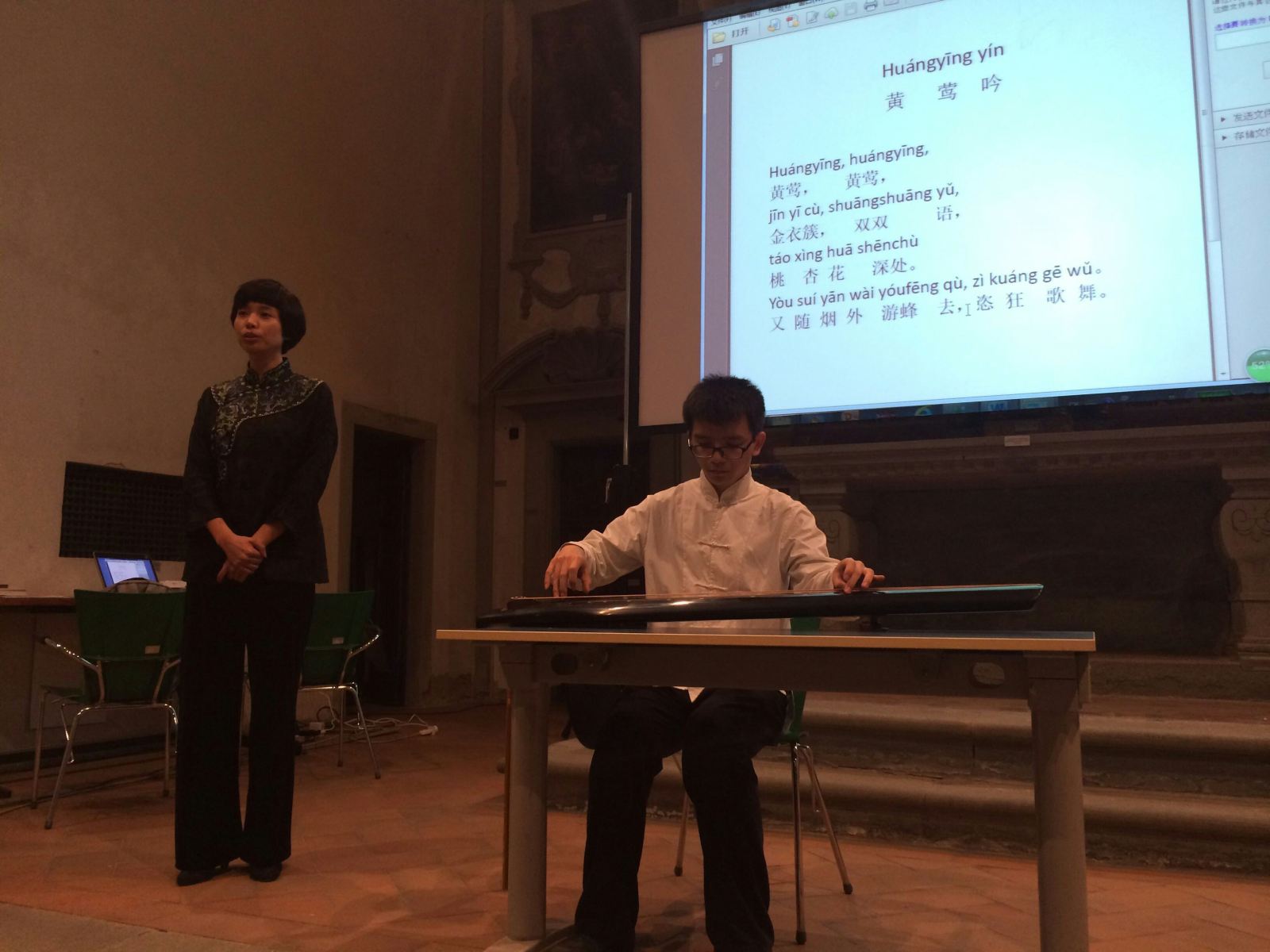 古琴艺术在中国古代文人的生活中扮演着极其重要的角色,为了让意大利朋友了解这种古老的乐器和特别的音乐形式,艺术家张锦冰由国画《听琴说图》讲起,介绍了古琴与中国书法、绘画、文学的关系,又通过控制拨弦的节奏和韵律展示了古琴特有的音韵。徐冠男老师绘声绘色的翻译以及与意方教师Claudia女士默契、互动的主持,调动了现场意大利听众的好奇和兴趣。三位艺术家演奏了《良宵引》《梅花三弄》等经典曲目。最后的互动环节由现场观众和音乐家共同完成了一曲《黄莺吟》,让大家直观的感受了中国词和曲的完美融合。