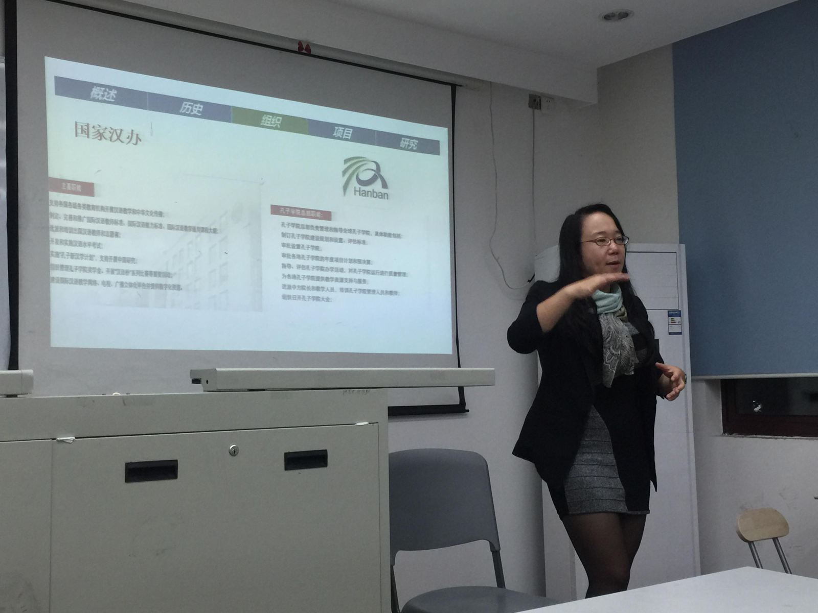 10月25日晚,同济大学国际文化交流学院副教授、同济大学孔子学院办公室副主任程妤博士为我院汉语国际教育硕士带来了一场题为《开通文化交流的高铁——孔子学院十一年》的精彩讲座,本次讲座是我院汉硕课程:语言、文化、教育专题讲座的第五讲,暨汉语国际传播论坛第五十五讲。