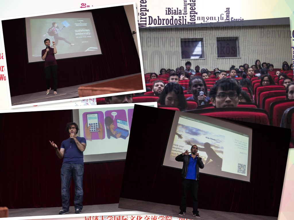 来自同济社团联的TJ-hands是一个中外学生共同参与的以向在校学生普及健康和安全生活方式为宗旨的志愿者组织,这次的引导课他们精心准备了丰富的演讲素材,以“Surviving University”为题,由五名来自不同学院和年级的留学生同学从个人体验出发,就留学生生活的衣食住行、医疗保险、学习时间管理、网络购物安全、个人财务管理、交通安全、消防安全等多个方面给出了具有可操作性的建议,同时还介绍了多种方便学习和生活的实用APP给大家。