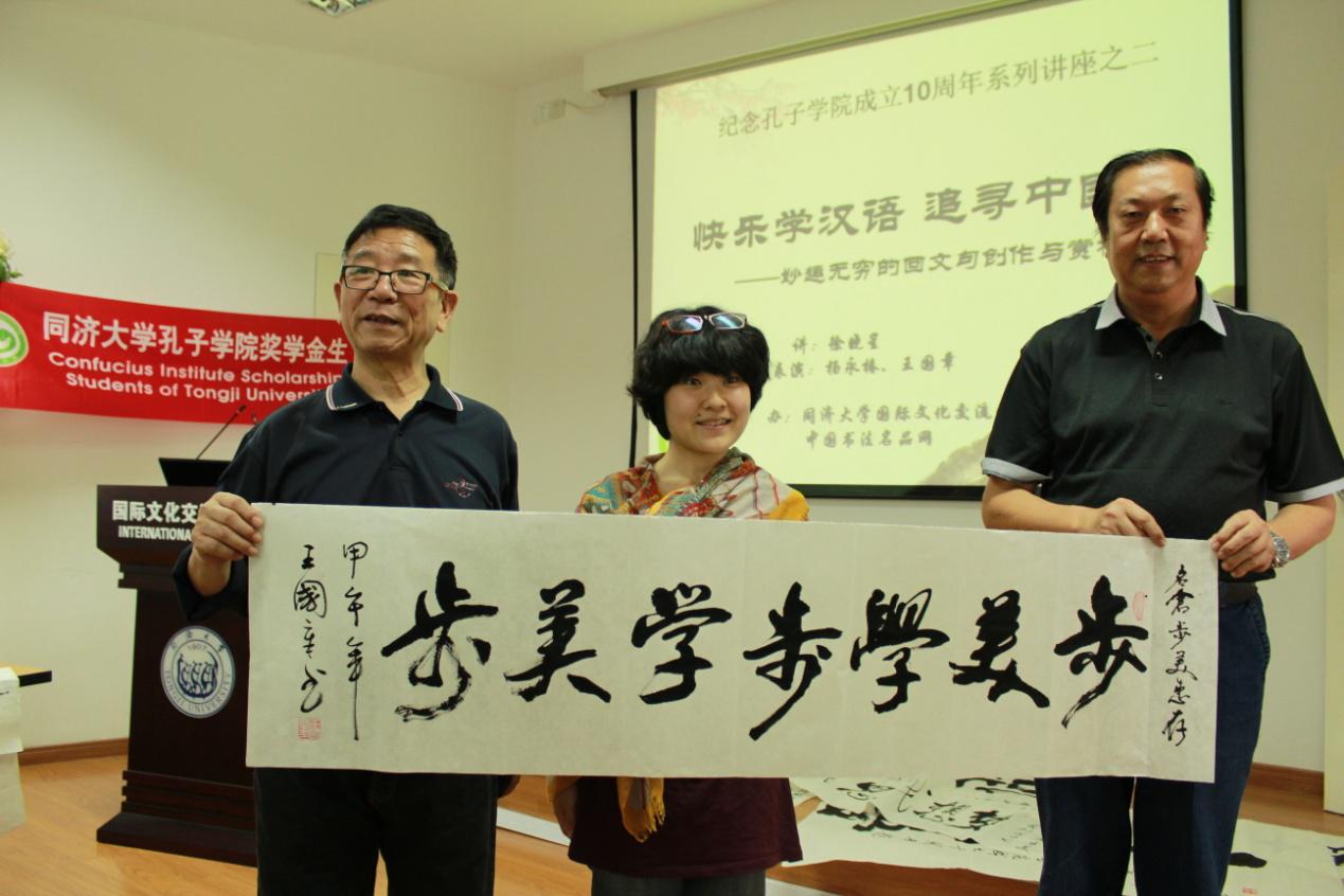 6月4日,纪念孔子学院成立十周年系列讲座之二“妙趣无穷的回文句创作与赏析”在我院312会议室举行。讲座邀请了“汉字棋”专利发明者徐晓星,从快乐学汉语出发,深入浅出地为孔子学院奖学金生们讲解中华回文句的赏析与创作奥妙。讲座还邀请了杨永椿、王国章老师两位民间书法家现场挥墨泼毫,将回文句与中国书法创作完美结合。